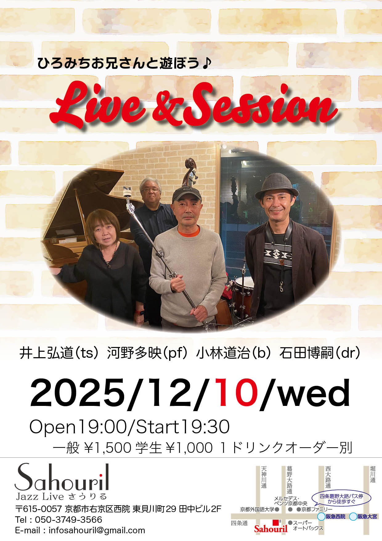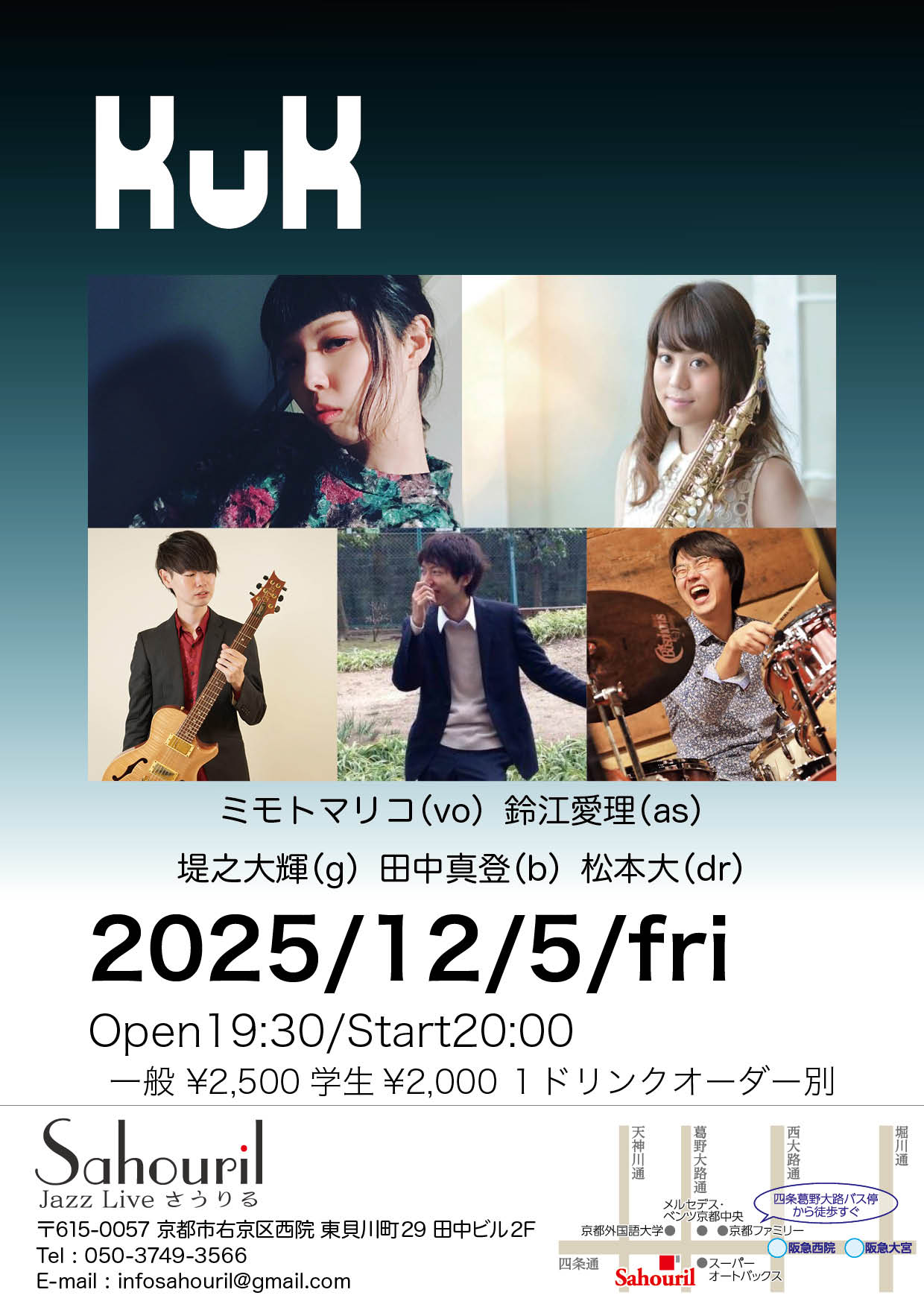 堀浩一郎(sax,fl,vo) 伊東奈美(pf) 上野寛史(g) 岡本晃(b) 平田幸裕(dr) Start 15:00 MC ¥2,500
