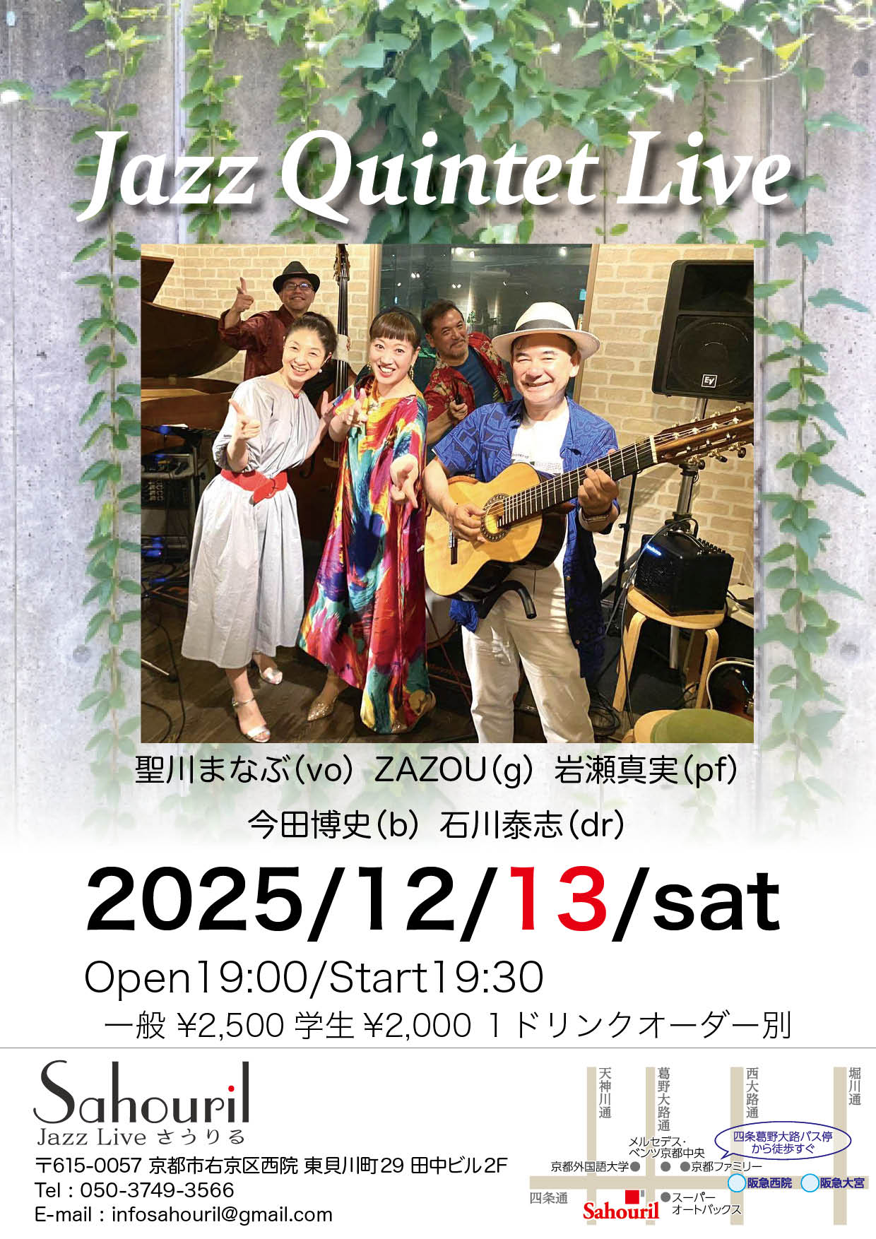 聖川まなぶ(vo) ZAZOU(g) 岩瀬真実(pf) 今田博史(b) 石川泰志(dr) Start 19:30 MC ¥2,500