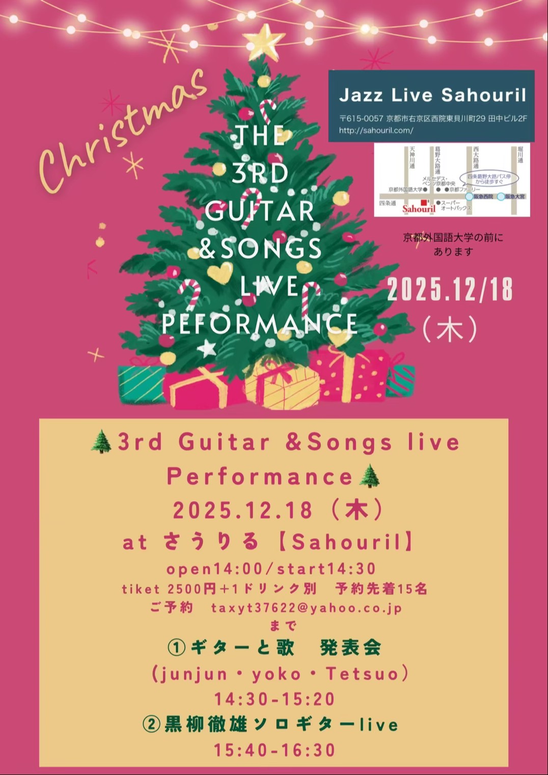 ①ギターと歌 発表会 (junjun・yoko・Tetsuo) 14:30〜15:20 ②黒柳徹雄ソロギターlive 15:40〜16:30 Start 14:30 MC ¥2,500