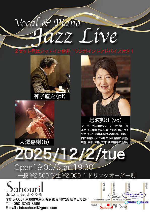 岩波邦江(vo) 神子直之(pf)大澤善樹(b) Start 19:30 MC ¥2,500