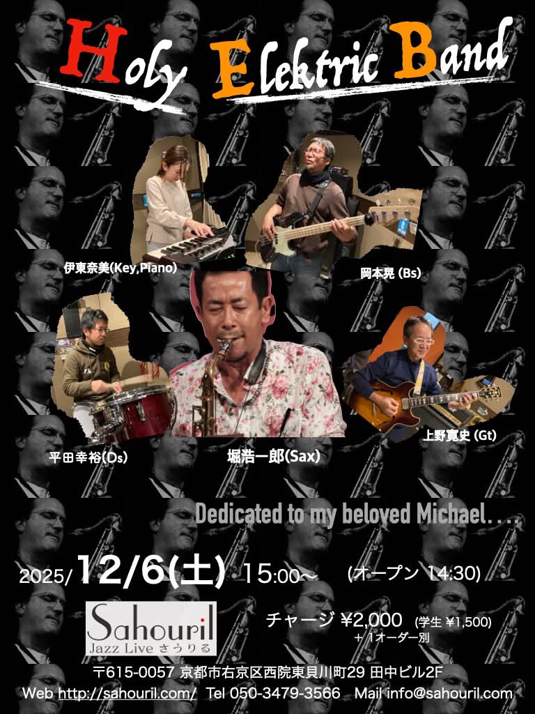 堀浩一郎(sax,fl,vo) 伊東奈美(pf) 上野寛史(g) 岡本晃(b) 平田幸裕(dr) Start 15:00 MC ¥2,500