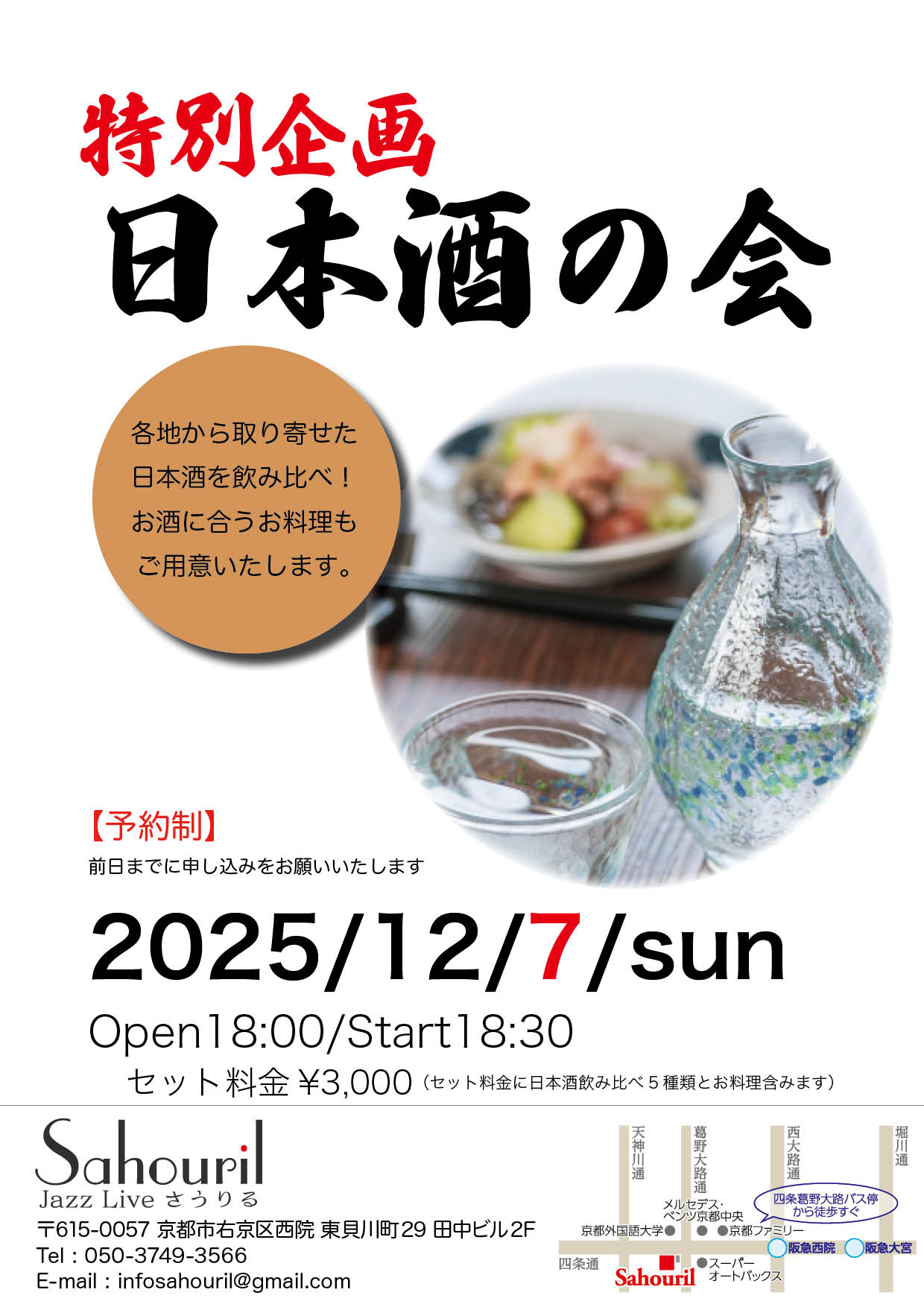 各地から取り寄せた日本酒を飲み比べ! お酒に合うお料理もご用意いたします。 予約制 Start 18:30 セット料金 ¥3,000