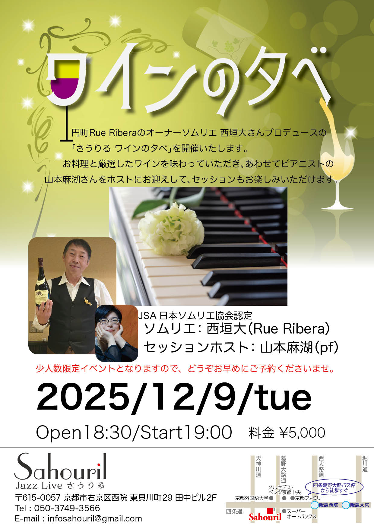 円町Rue Riberaのオーナーソムリエ 西垣大さんプロデュースの「さうりる ワインの夕べ」を開催いたします。 お料理と厳選したワインを味わっていただき、あわせて山本麻子さん(pf)をホストにむかえてのセッションも楽しみましょう。 少人数限定イベントとなりますので、どうぞお早めにご予約くださいませ。 ソムリエ: 西垣大(Rue Ribera) セッションホスト: 山本麻子(pf) Start 19:00 MC ¥5,000