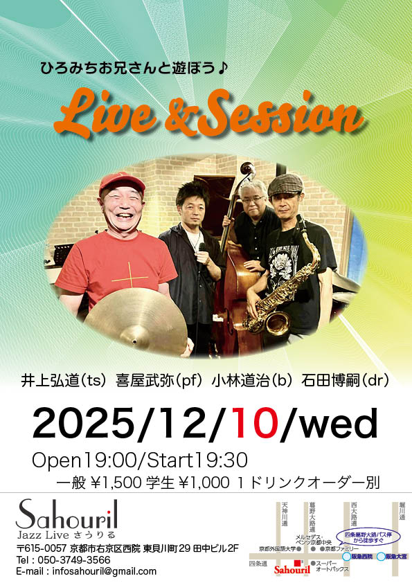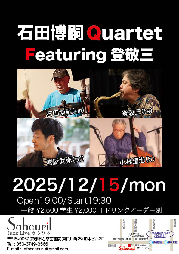 登敬三(ts) 喜屋武弥(pf) 小林道治(b) 石田博嗣(dr) Start 19:30 MC ¥2,500