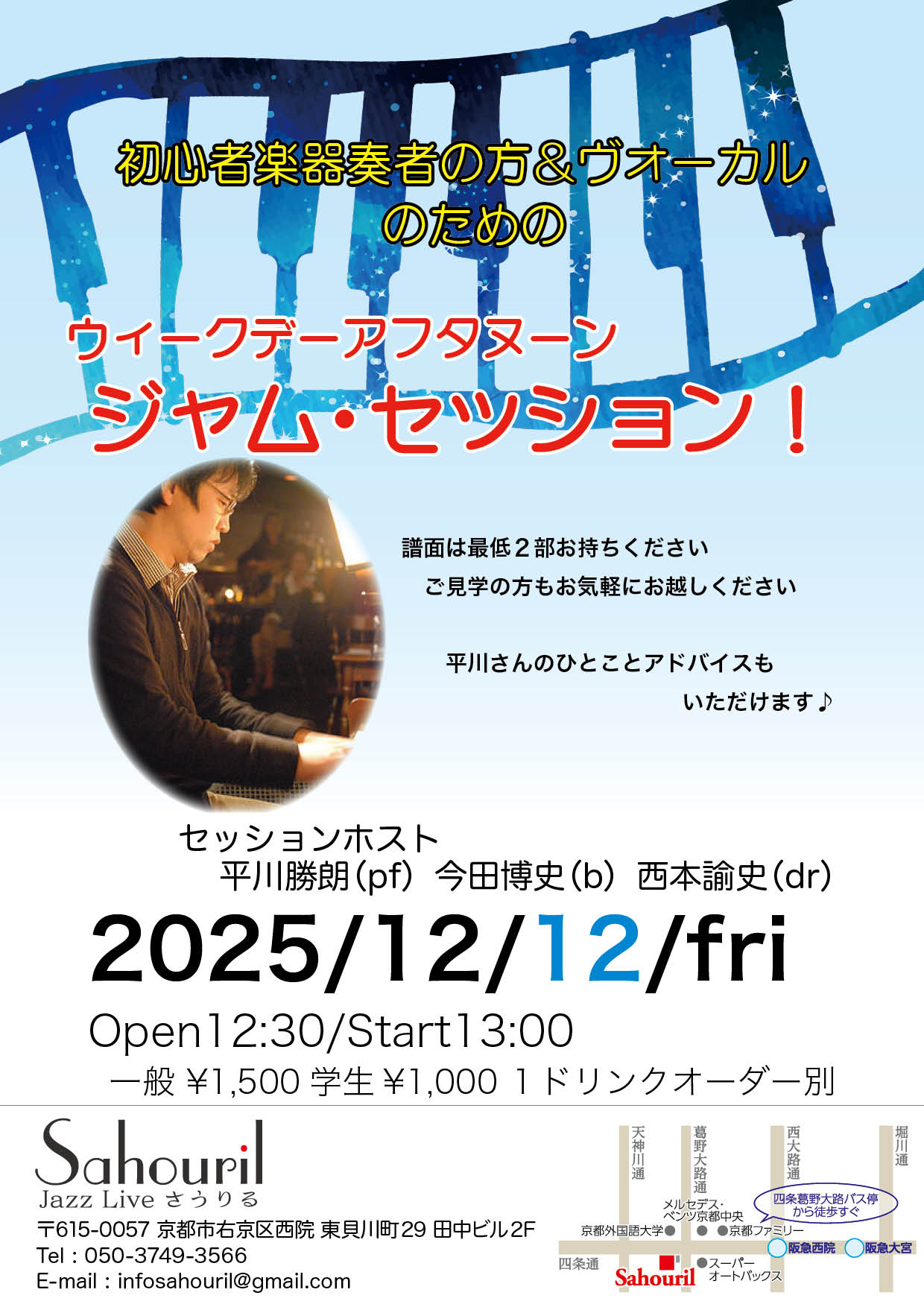 平川勝朗(pf) 今田博史(b) 西本諭史(dr) Start 13:00 MC ¥1,500