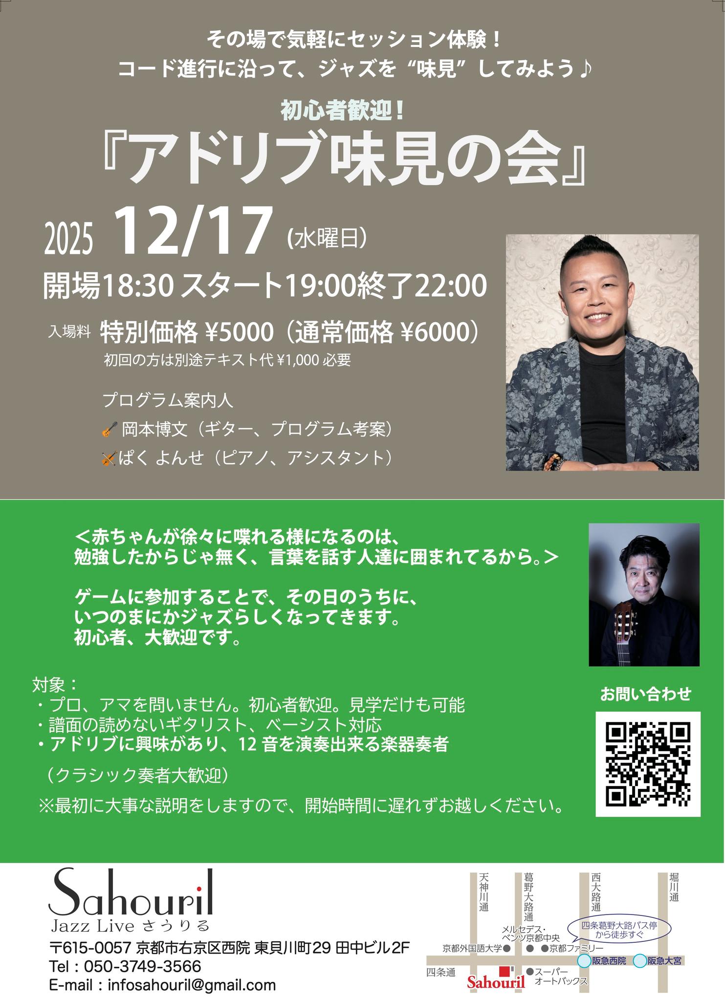 講師:岡本博文 ゲストアシスタント:ぱくよんせ Start 19:00 MC ¥5,000