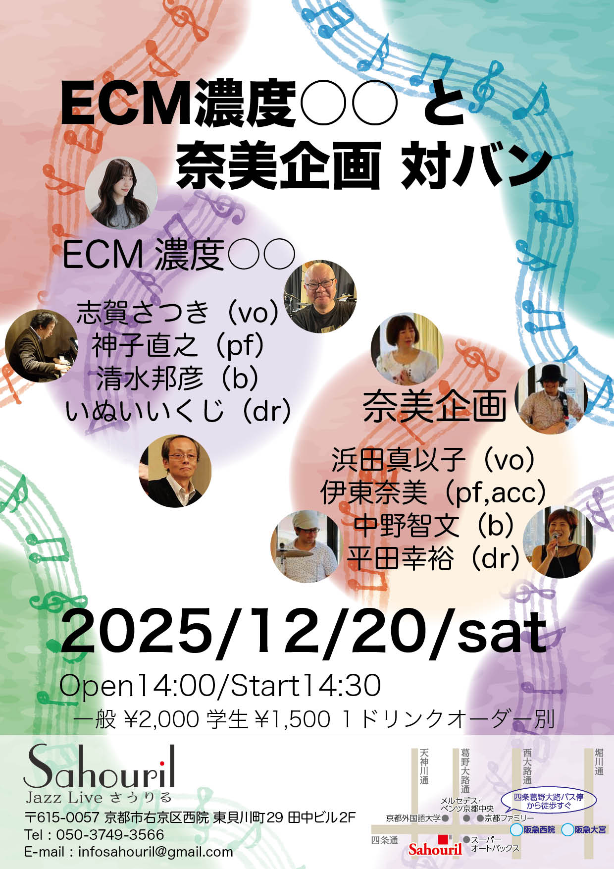 「ECM濃度○○」 志賀さつき(vo) 神子直之(pf) 清水邦彦(b) いぬいいくじ(dr) 「奈美企画」 浜田真以子(vo) 伊東奈美(pf) 中野智文(b) 平田幸裕(dr) Start 14:30 MC ¥2,000