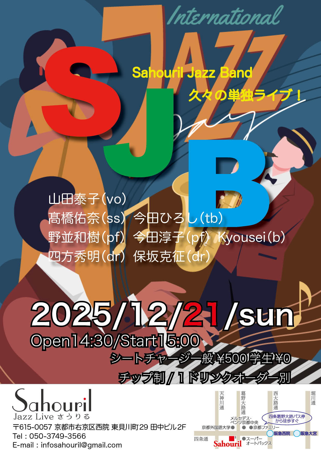 山田泰子(vo) 髙橋佑奈(ss) 今田ひろし(tb) 野並和樹(pf) 今田淳子(pf) Kyousei(b) 四方秀明(dr) 保坂克征(dr) Start 15:00SC ¥500(投げ銭制)