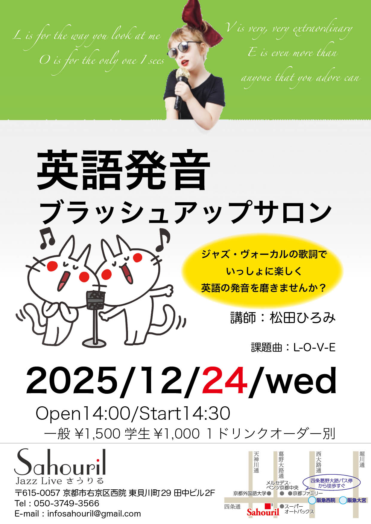 講師:松田ひろみ サポート:今田博史(g) Start 14:30 MC ¥1,500