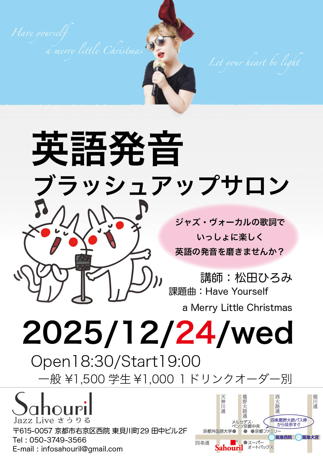 講師:松田ひろみ サポート:今田博史(g) Start 19:00 MC ¥1,500