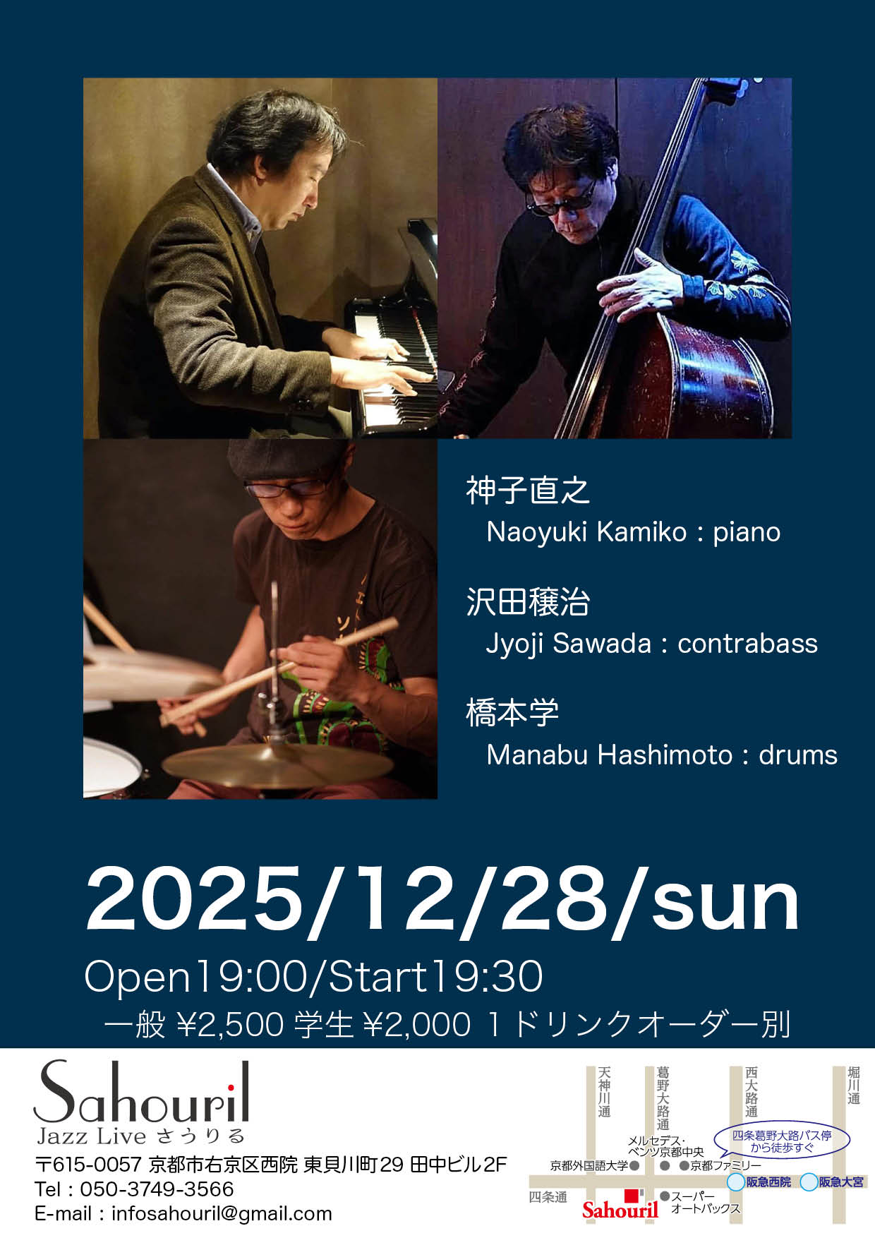 神子直之(pf) 沢田穣治(b) 橋本学(dr) Start 19:30 MC ¥2,500