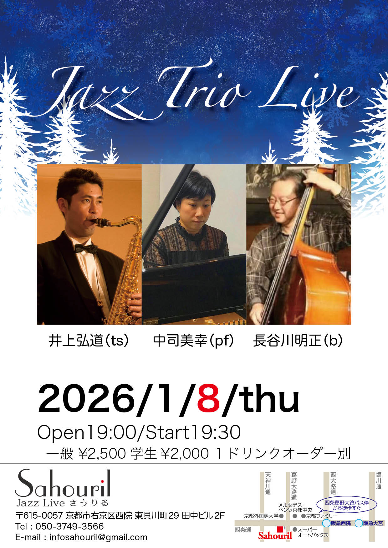井上弘道(ts) 中司美幸(pf) 長谷川明正(b) Start 19:30 MC ¥2,500