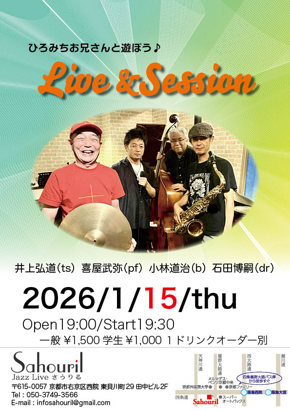 井上弘道(ts) 喜屋武弥(pf) 小林道治(b) 石田博嗣(dr) Start 19:30 MC ¥1,500