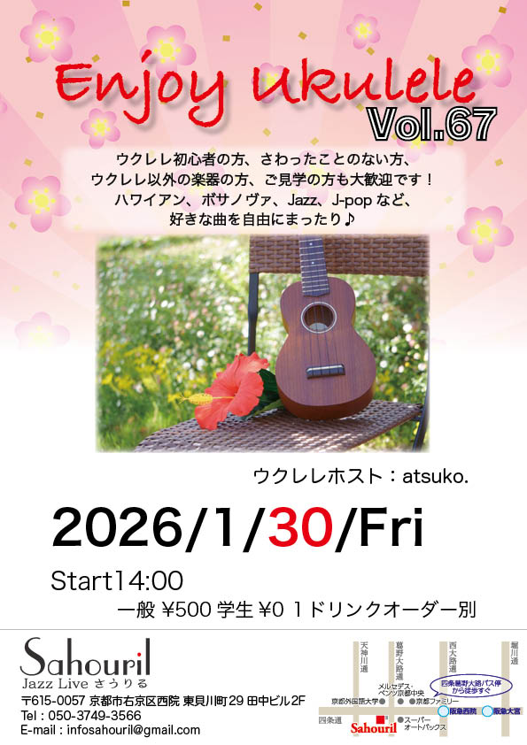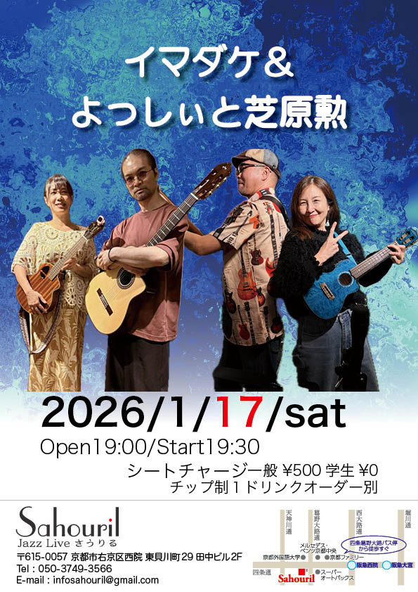 太田淑江(vo, uku) 芝原勲(g) atsuko.(vo, uku) 今田博史(g) Start 19:30 SC ¥500(投げ銭制)