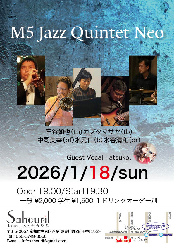 三谷如也(tp) カズタマサヤ(tb) 中司美幸(pf) 水元仁(b) 水谷清和(dr) ゲスト:atsuko. Start 19:30
