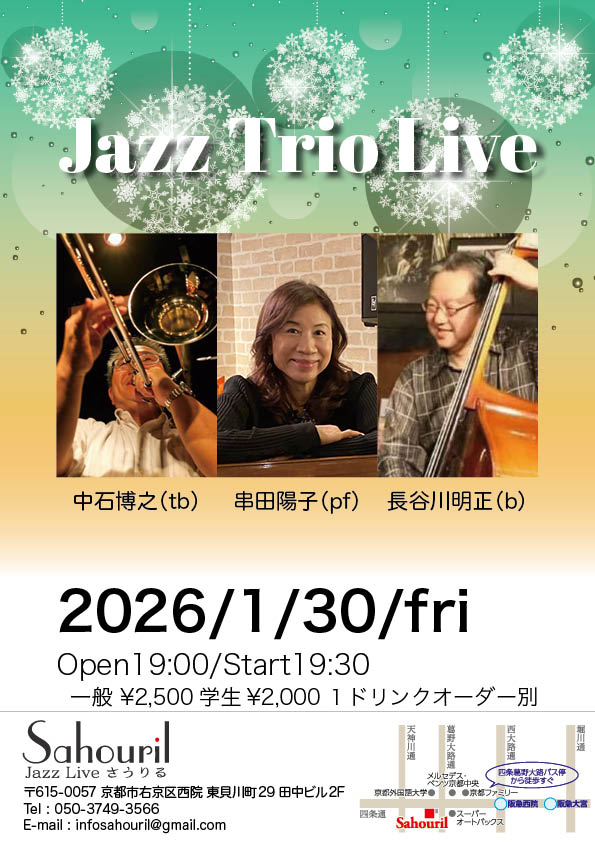中石博之(tb) 串田陽子(pf) 長谷川明正(b) Start 19:30 MC ¥2,500