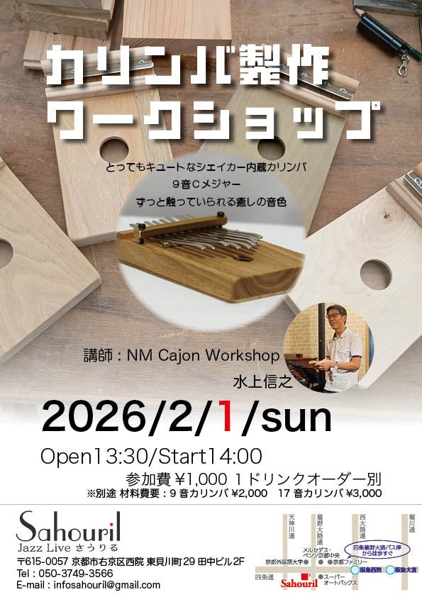 講師: NM Cajon Workshop 水上信之 ※予約制 Start 14:00 参加費 ¥1,000 別途 材料費が必要です 9音カリンバ:¥2,000 17音カリンバ:¥3,000