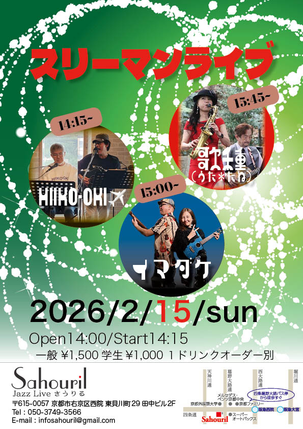 出演: HIKO-OKI イマダケ 歌種(うた*たね) Start 14:15 MC ¥1,500